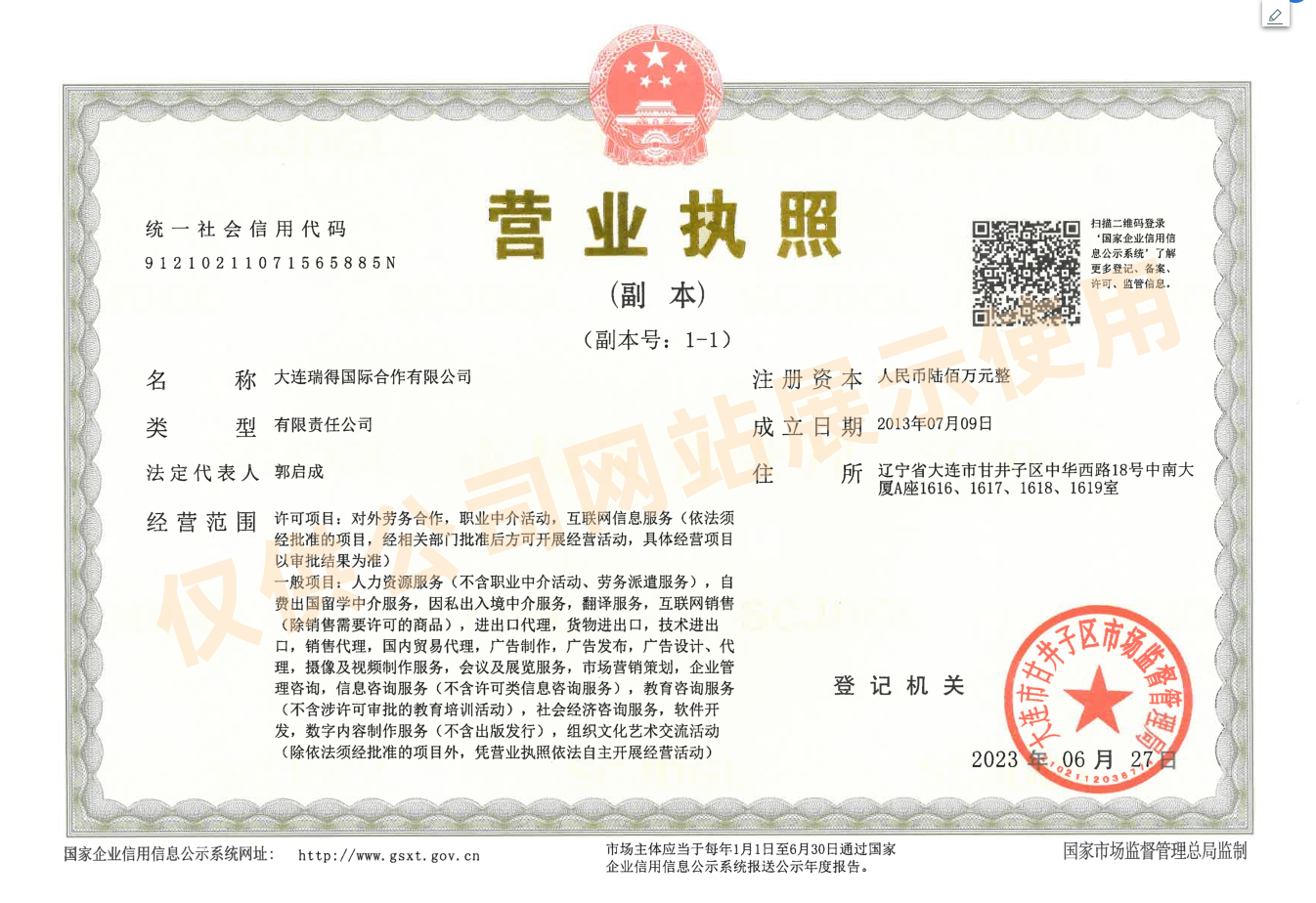 大連瑞得國際合作有限公司是專注為日本歸國人員辦理厚生年金及二次退稅的涉外退稅服務(wù)機構(gòu)。同時是經(jīng)中華人民共和國商務(wù)部批準(zhǔn),專業(yè)從事日本、新加坡等國家勞務(wù)派遣及海外留學(xué)的資質(zhì)公司。目前在全國及海外共設(shè)立7家分公司。目前累計服務(wù)年金客戶10余萬人,輸送出國勞務(wù)人員3000余人。