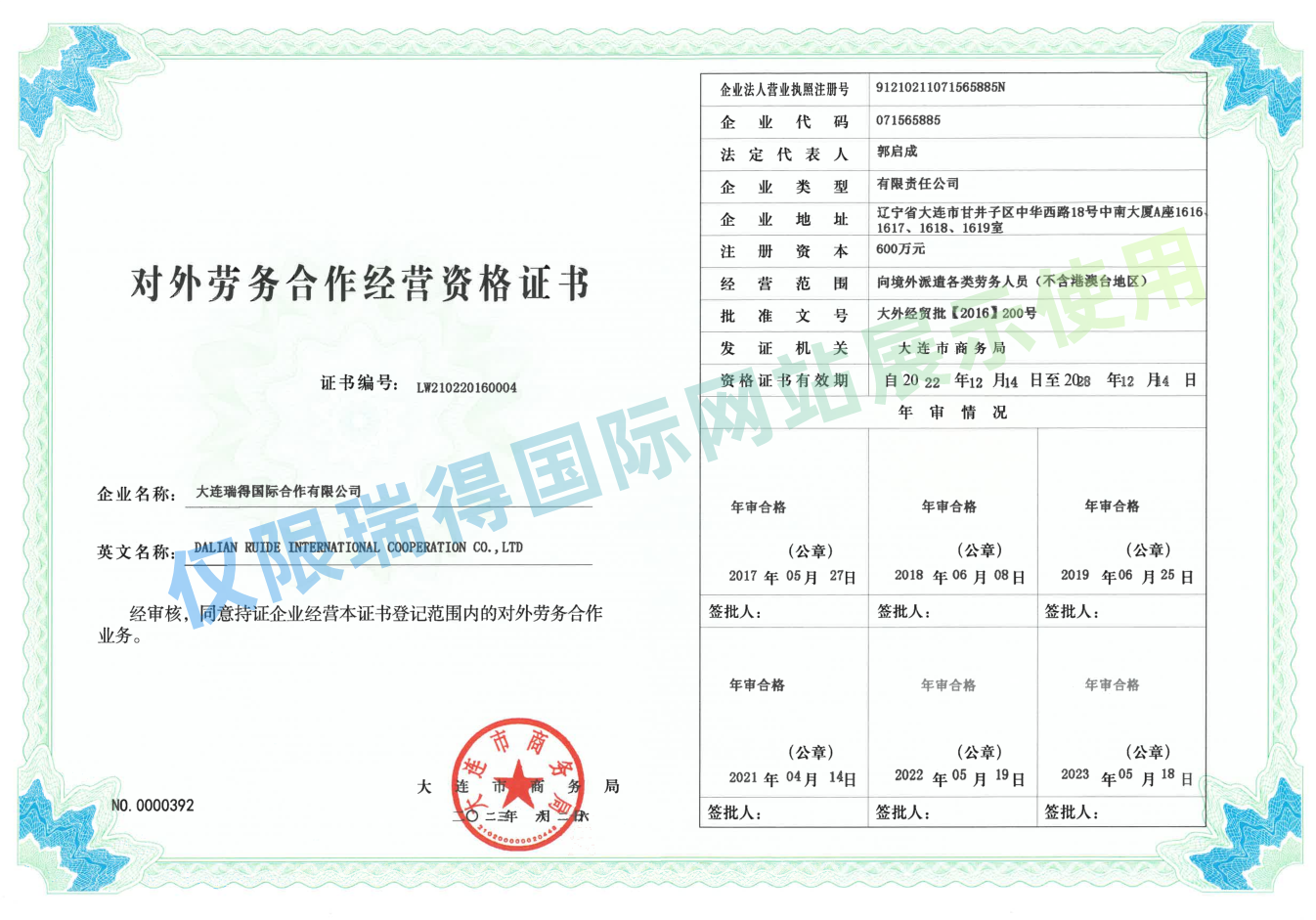中國商務(wù)部出國勞務(wù)資質(zhì)證書編號 LW210220160004