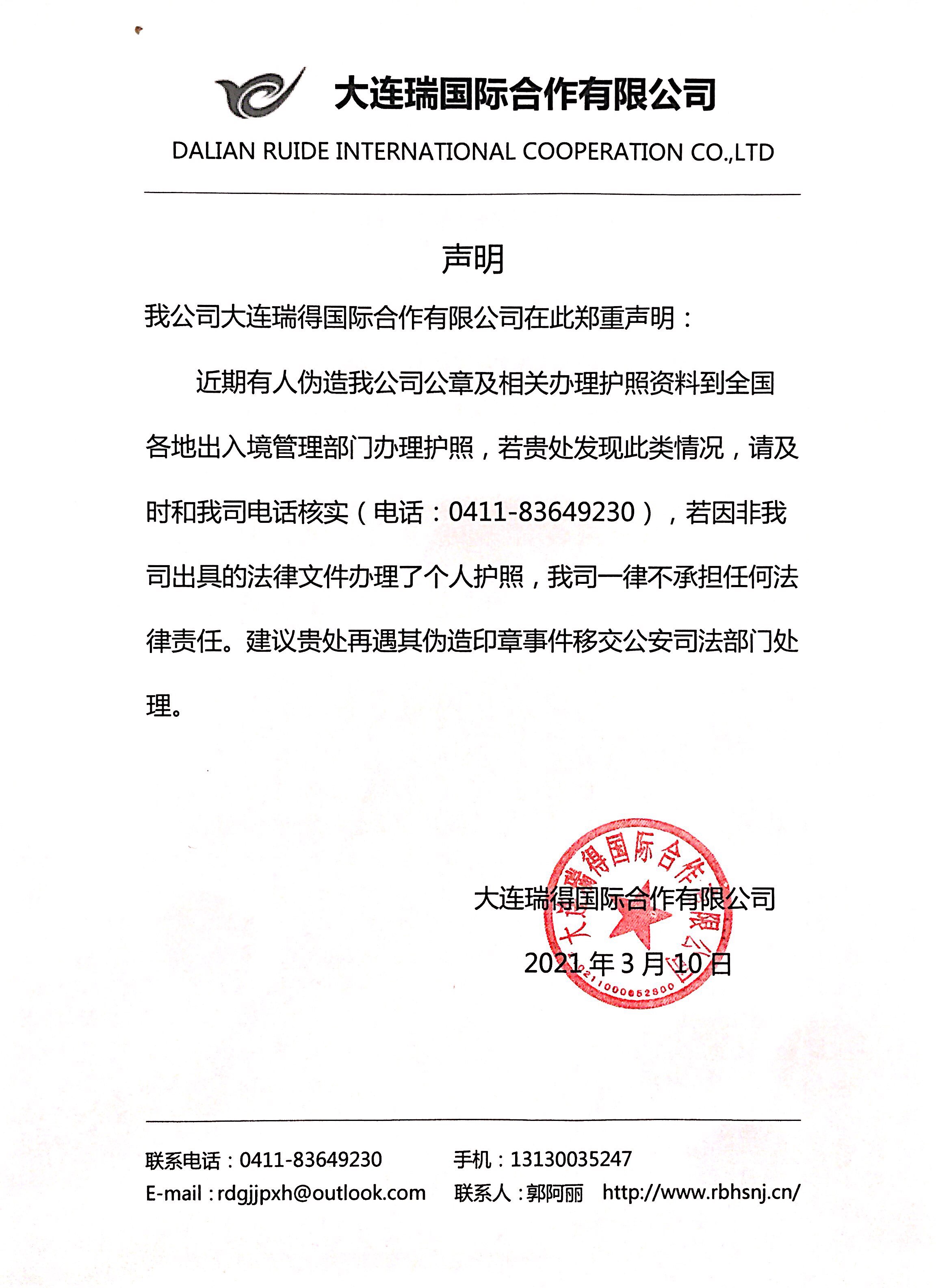 瑞得國(guó)際鄭重聲明——偽造我司印章及材料辦理護(hù)照,我司一律不予承擔(dān)任何法律責(zé)任